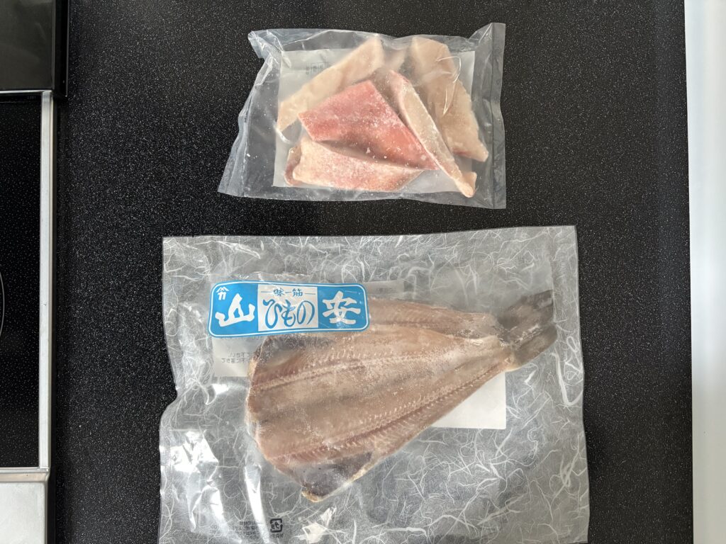 上の写真は、赤魚の冷凍と縞ホッケの冷凍(25cm2枚)です。どちらも380円(税抜)