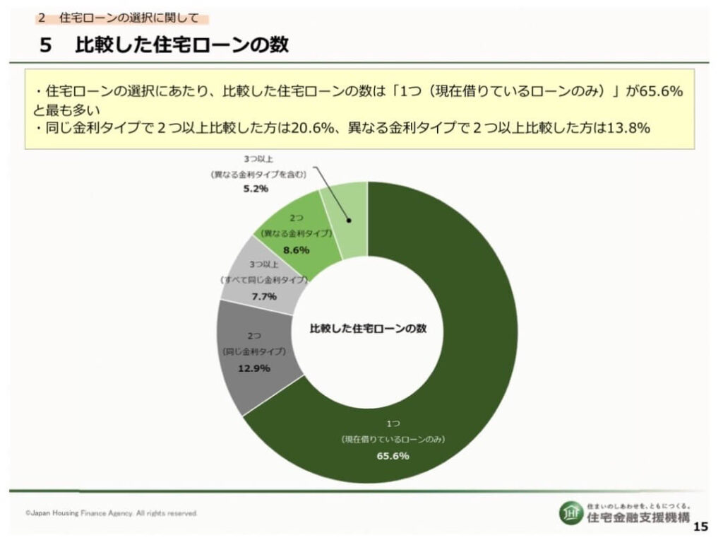 住宅金融支援機構の調査によると、住宅ローンを選ぶ際に65.6%の人が「1つだけ比較(=ほぼ比較していない)」